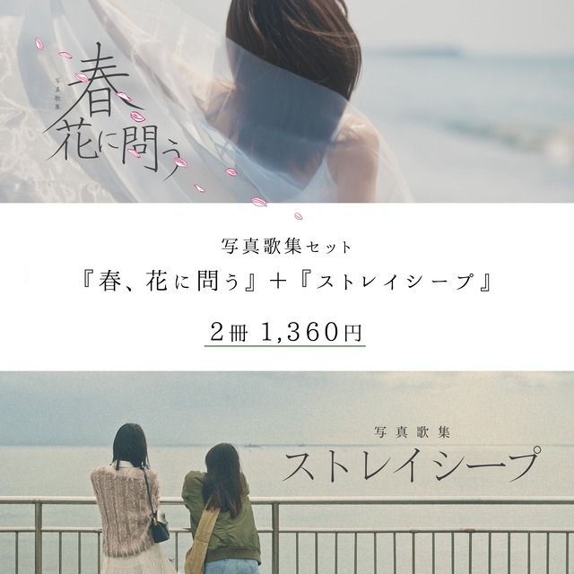 写真歌集最新刊『春、花に問う』と、 既刊写真歌集『ストレイシープ』のセット商品です。 それぞれ買うより240円お得なセット。 送料も無料となります。 数に限りがございますので、 写真歌集をお持ちでない方はぜひご活用ください。 ○写真歌集『春、花に問う』 特設サイト http://www.kokoiru.com/haruhana/ ○短歌朗読ショートフィルム『ストレイシープ』 https://www.youtube.com/watch?v=1As-3BJ7-mA ※それぞれの歌集の詳細は、各商品のページをご覧ください。